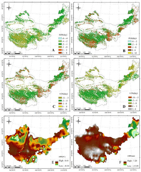 3.1.2. Dynamics of Plant Phenology, AMT, and AMP in China’s Grasslands
