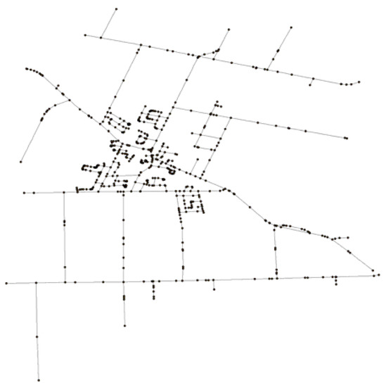 This first conversion strategy constructs a graph by removing geometric detail in the spatial network and in doing so, we get an efficient expression in return. If we want to keep the geometric properties in the converted graph, then the function readshpnw can be used where all the coordinates are taken as vertices if the parameter Detailed is specified as TRUE. For example, with the following R code (snippet 2), a second ‘igraph’ graph is produced with all geometric detail retained (Figure 2). It looks the same as the spatial network and is comprised of 597 vertices and 642 edges. This contrasts with the first graph conversion (Figure 1b), which has a much smaller number of vertices and edges, that is, 298 and 343, respectively. Observe that the parameter ea.prop is used here to denote whether the attributes of each polyline should be kept for the edges.