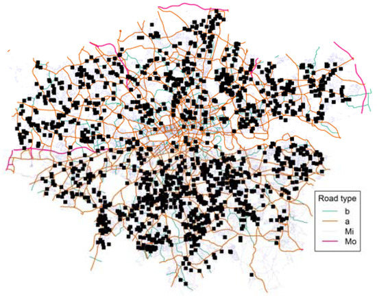Integration of the London property locations onto the London road network using strategies 1 and 2. (a) Solution with strategy 1; (b) Solution with strategy 2.