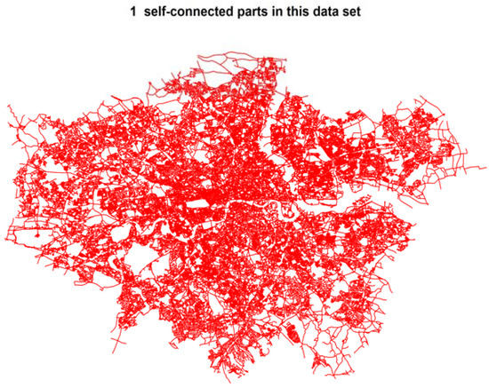 Figure 4 clearly indicates that the London road network is highly self-connected, where only one self-connected part was found (the plot title always returns this). This level of connectivity is sufficient for subsequent operations and analyses and is expected for a carefully prepared network data set. In practice, however, many spatial network data sets have poor connectivity conditions, requiring much pre-processing. In this respect, it is useful to provide another example—this time using part of the Estevan road network downloaded from OpenStreetMap [35]. Thus, the following R commands (snippet 5) returns this network’s connectivity conditions (mapped in Figure 5):