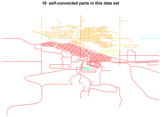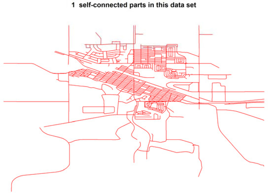 Completeness and topology correctness are fundamental for ensuring connectivity in a spatial network [34]. Whether or not a spatial network is self-connected, where no disconnected portions or islands exist in the network, that is, at least one path could be found between any pair of vertices. Connectivity is essential for calculating network distances or shortest paths successfully. To confirm the connectivity of a given spatial network the shp2graph function, nt.connect, searches through all the self-connected parts in the input network and returns a series of self-connected parts with the most vertices. In this sense, it always possible to get at least one self-connected network from this output. We can demonstrate this function as follows with this R code (snippet 4) together with the mapped output in Figure 4: