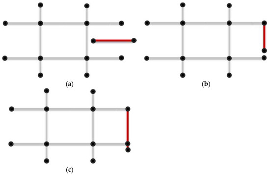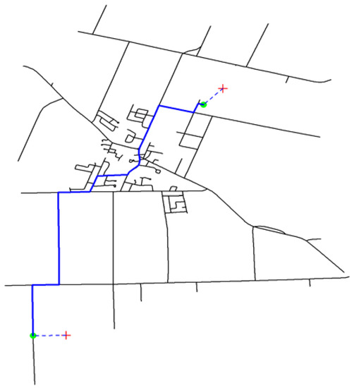 As shown in Figure 5, the Estevan road network is comprised of ten unconnected parts marked in ten different colors. Such poor connectivity is likely due to various topology errors, where the three most common types are: dangling arc, overshoot and undershoot [36]. These are illustrated in Figure 6a–c and are defined as follows: