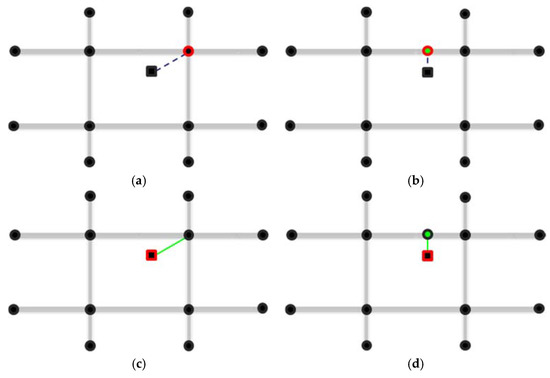 Four strategies to integrate points/locations within the spatial network. (a) Strategy 1: represent each point with its nearest vertex; (b) Strategy 2: represent each point with its nearest geometric point; (c) Strategy 3: add a pseudo edge (colored green) between each point and its nearest vertex; (d) Strategy 4: Add a pseudo edge (colored green) between each point and its nearest geometric point.