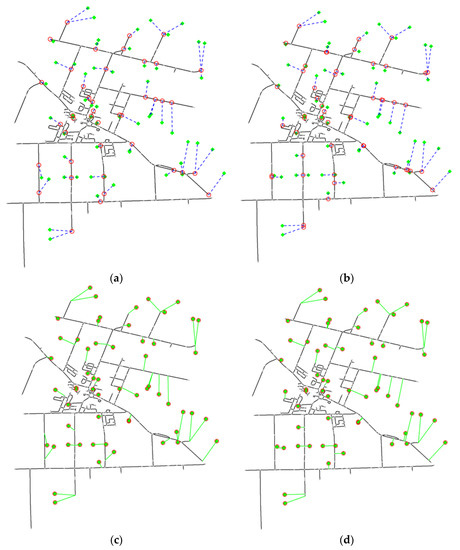 Examples of integrating points/locations with a spatial network (Ontario road data), where green dots represent points given, a blue dash in (a,b) indicate the closest relationship between a point and its nearest vertex/position on the network, green lines in (c,d) mean the edges newly added and red circles mark the representative vertices. (a) Solution with strategy 1; (b) Solution with strategy 2; (c) Solution with strategy 3; (d) Solution with strategy 4.