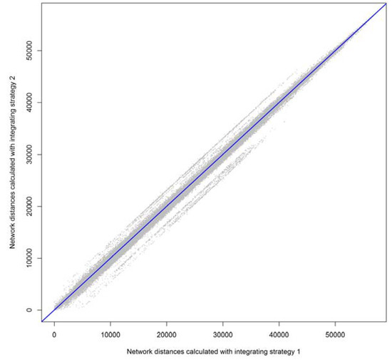 Code snippet 10: # Strategy 1 LN.pt.VIDs1 <- as.numeric(LN.pt2nt1[[3]]) V.idx1 <- as.numeric(levels(as.factor(LN.pt.VIDs1))) ND.mat1 <- shortest.paths(LN.ig1, v = LN.pt.VIDs1, to = V.idx1) ND.mat1 <- ND.mat1[, match(LN.pt.VIDs1, V.idx1)] # Strategy 2 LN.pt.VIDs2 <- as.numeric(LN.pt2nt2[[3]]) V.idx2 <- as.numeric(levels(as.factor(LN.pt.VIDs2))) ND.mat2 <- shortest.paths(LN.ig2, v = LN.pt.VIDs2, to = V.idx2) ND.mat2 <- ND.mat2[, match(LN.pt.VIDs2, V.idx2)] # Scatterplot plot(ND.mat1, ND.mat2, pch = 16, cex = 0.2, col = “grey”, xlab = “Network distances calculated with integrating strategy 1”, ylab = “Network distances calculated with integrating strategy 2”) abline(a = 0, b = 1, col = “blue”, lwd = 2)