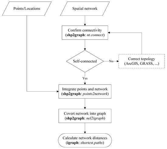 As a useful summary of this work, a flow chart for calculating network distances with shp2graph and igraph is given in Figure 13.