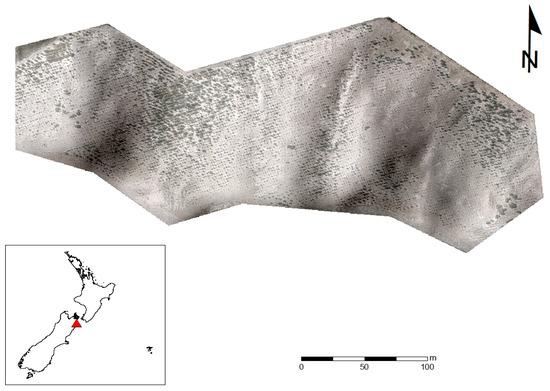 A hilly broken landscape, covered by a young Eucalyptus spp. plantation, in the southern area of the Marlborough region, New Zealand, was selected for this study (Figure 1). The site (−41.7364606452187 latitude, 174.1221316582747 longitude) ranges in elevation from 10 m to 82 m above sea level (asl), has slope ranging from 13° to 32°, and covers 4.7 hectares. It has predominantly warm, dry, and settled weather during the summer months, with daytime maximum air temperature ranging from 20 °C to 26 °C, but occasionally rising above 30 °C. Winter days often start with a frost, but are usually mild overall, with daytime maximum air temperature ranging from 10 °C to 15 °C [29].