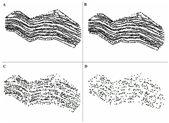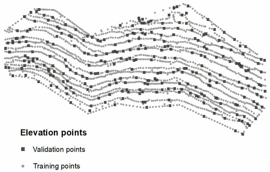 On the contrary, it is not suitable to produce high-resolution DEMs from sparse data, as the surface will be shaped by the proliferated interpolator and interpolation artefacts [58,64,65], as well as the resolution constraints designated by the data density [66]. For this study, all the data were collected in a way that was assumed to give an evenly distributed dataset. Hence, the effect of distribution was not tested explicitly. Moreover, the selection of validation points, thinning, and study site characteristics would have resulted in some spatial variation in point distribution. Firstly, the validation points had high positive spatial correlation with the training dataset as they were not independently collected and lying in line with each other. Secondly, even though the thinning routine was performed in a randomised manner, minor clustering may have influenced the results. Thirdly, the study site was relatively small. Hence, it is expected that the results are site specific and could vary with changes in site or surface structure. For example, if the site were more rugged than the one used here, a higher level of error could be expected.