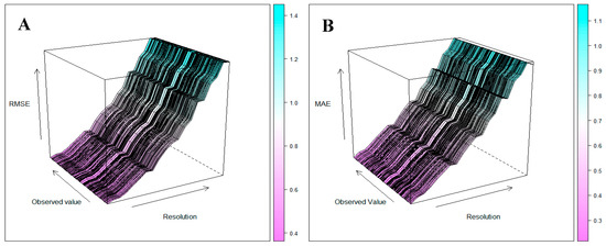 Effect of resolution at each observation point by (A) RMSE (root mean square error) and (B) MAE (mean absolute error).