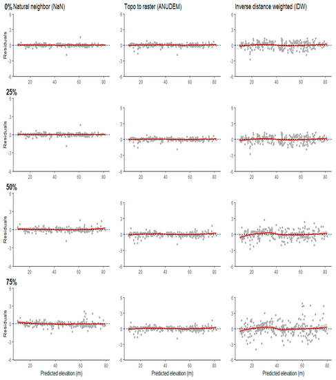 Given the high r2 values, it is unsurprising that generally the observed and predicted values were in agreement (Figure 5). The observed and predicted values of the data points were slightly more scattered in the DEM, interpolated using IDW. Figure 5 also shows that the spread of the residuals increased when elevation data were thinned by 75% prior to DEM interpolation.