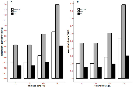 RMSE and MAE data provide better opportunities to discriminate between different interpolation algorithms with thinned data. IDW yielded the highest RMSE and MAE, irrespective of the level of data thinning applied (Figure 6). For IDW, RMSE ranged between 0.631 m and 1.388 m, and MAE ranged between 0.471 m and 0.984 m. In contrast, NaN and ANUDEM interpolations resulted in lower RMSE and MAE values at all thinning intensities. RMSE ranged between 0.239 m and 0.614 m and between 0.305 m and 0.877 m for NaN and ANUDEM, respectively, while MAE ranged between 0.152 m and 0.301 m and between 0.197 m and 0.526 m. Irrespective of interpolation algorithm, RMSE and MAE remained reasonably consistent until 75% thinning, when there was a large increase in both metrics. At 75% thinning, the density of the points used to interpolate the DEM was only 0.129 points m−2, compared with 0.519 points m−2 in the un-thinned data.