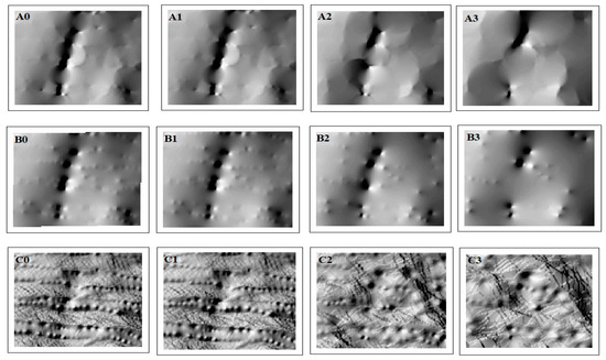 Hillshade surfaces produced from DEMs interpolated by (A) nearest neighbor, (B) ANUDEM, and (C) IDW methods. Numbers 0 to 3 represent 0%, 25%, 50%, and 75% elevation data thinning prior to DEM interpolation.