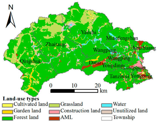 The Mentougou District is in the west of Beijing, China (Figure 1), with rich mining resources. Coal and limestone dominate. The Mentougou District was the energy source base of Beijing for a long time. However, from 2007, the Beijing municipal government converted its emphasis from mining extraction to ecological environment preservation in the district. A total of 267 mines were closed, leaving 4130 ha of AML for land reclamation. According to the General Land-Use Plan in Mentougou District (2006–2020), 3573 ha of AML will be reclaimed by the year 2020. Most AML patches are distributed in the east, with mainly small ones in the west. The 2007 land-use map was classified into eight types, including cultivated land, garden land, forest land, grassland, construction land, AML, water, and unutilized land. The respective numbers of the eight land-use categories are 1735 ha, 3925 ha, 101,904 ha, 19,805 ha, 3596 ha, 4130 ha, 1914 ha, and 7806 ha, respectively, as shown in Figure 2. Land use information was obtained from Beijing Municipal Bureau of Land and Resources.