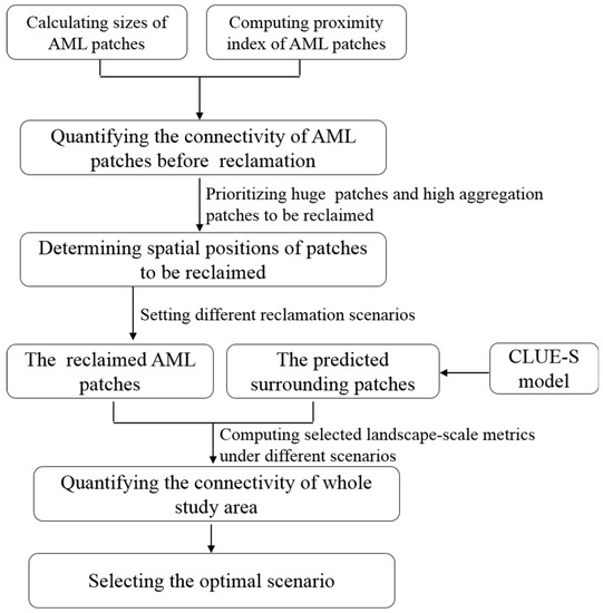 This paper first incorporates the patch sizes and the proximity index to characterize the connectivity of AML patches prior to reclamation. Then it sets a range of reclamation scenarios based on different reclamation targets. Finally, it assesses the scenarios through selected landscape-scale graphics to demonstrate landscape connectivity. The technical flow of this study is illustrated in Figure 3.