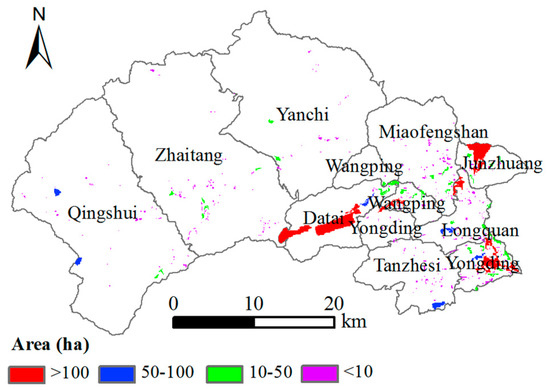 The AML patch sizes were calculated in ArcGIS 10.2. Table 2 shows the descriptive statistics of the different sizes of AML patches. Six AML patches were larger than 100 ha in 2007, and most of them passed through the coal mining industrial region located in the eastern part of the research area. The spatial distribution of AML patches is shown in Figure 4. Small plots were mainly scattered around the townships of Qingshui, Zhaitang, and Yanchi. These three townships have higher elevation and they primarily relied on forestry rather than coal mining for their economic survival.