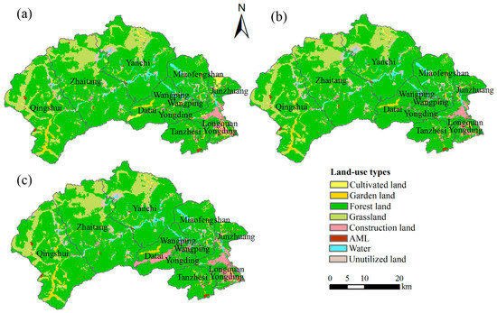 Land-use maps of the entire study region in 2020 under different scenarios: (a) Scenario 1: fertility dependent cultivation or forestry; (b) Scenario 2: elevation dependent cultivation or forestry; (c) Scenario 3: urbanization, cultivation and forestry.