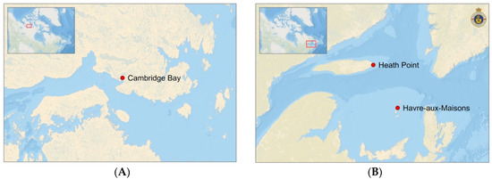 Study sites of (A) Cambridge Bay, Nunavut and (B) Heath Point, Quebec, and Havre-aux-Maisons, Quebec. Background map © ESRI.