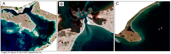 WorldView imagery for (A) Cambridge Bay, Nunavut; (B) Havre-aux-Maisons, Quebec; and (C) Heath Point, Quebec.
