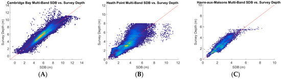 Scatterplots comparing multi-band SDB and survey depths for (A) Cambridge Bay, (B) Heath Point and (C) Havre-aux-Maisons. Red and yellow colours indicate higher concentrations of survey points.