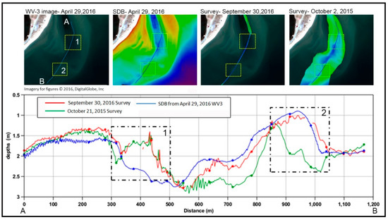 Results achieved for Havre-aux-Maisons demonstrated that in dynamic areas, SDB can be more reliable than recent survey information. Depths extracted over the transect line (blue line, A to B) in Figure 4 demonstrate that the 2016 SDB results are closer to the 2016 multibeam survey than the 2016 and 2015 multibeam surveys are to each other. The largest errors in the SDB results are located in zone 1, but the differences are within CHS’s 1 m tolerance threshold for SDB. Near the 600 m point of the transect, there is a clear indication of the changes which occurred from 2015 to 2016, especially in zone 2. These changes suggest that the 2015 survey is no longer reliable in this area. These results suggest another useful application of SDB for dynamic area monitoring and change detection. This approach could help determine if new survey information is required by highlighting locations of change for potential re-surveying. Such an approach would minimize the required geographic coverage of surveys, thus reducing survey costs. It would also support immediate improvements to safety to navigation as areas of change could be described to mariners well in advance of the completion of new surveys.