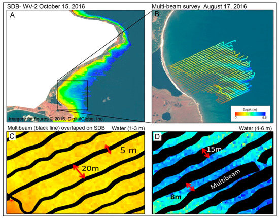 Another use of SDB extrapolation for CHS could be to fill gaps in survey data. Achieving full bottom coverage with shallow water multibeam systems can be time-consuming as the swath coverage is about three times the water depth. This requires ship tracks to be positioned very close together to allow for overlap between passes. Figure 5C,D shows the width of the multibeam data (black line) overlapped with the full coverage of SDB for two ranges of water depth: 1–3 m (Figure 5C) and 4–6 m (Figure 5D) for Heath Point. With water depths of 1–3 m, the swath of the multibeam survey covers ~5 m, creating gaps between survey lines of ~20 m. In waters of 4–6 m, the multibeam swath covers ~15 m with gaps between survey lines of ~8 m. These figures clearly illustrate the potential of SDB for reducing shallow water gaps within CHS survey data, an application which can reduce costs (through minimization of survey coverage) and improve safety to navigation (potential feature identification in gap regions).