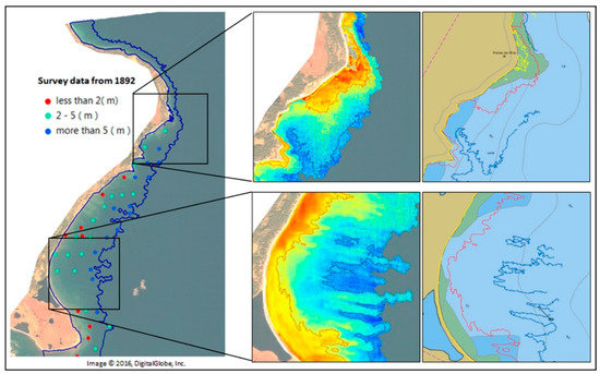 Left panel shows locations of 1892 leadline soundings which provided source information for the creation of ENC isobaths (gray lines in right panels). Centre panels show SDB coverage and isobaths for 2 (red) and 5 m (blue) depths. Right panels compare SDB and ENC isobaths. Note the significant differences between the isobaths locations.