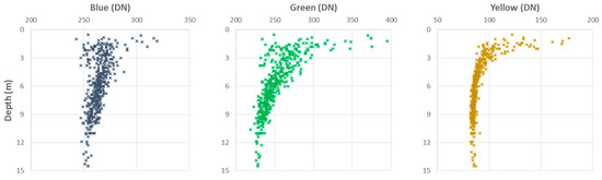 Plot of Digital Number (DN) values from the Cambridge Bay WorldView-2 image with associated depths from the 2014 multibeam survey. Left, center and right panels respectively show the blue, green and yellow bands.