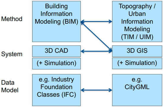 Although it would be more appropriate to discuss “BIM/UIM integration” in cases where the authors mean the integration of the two methods, or “computer-aided design (CAD)/GIS integration” in cases where the authors mean the integration of software tools, in most of the literature, the term “BIM/GIS integration” is used. This is problematic, because here a method (BIM) is being compared to a system (GIS). However, in the remainder of this paper, the term “BIM/GIS integration” is used and means the integration on a data model level.