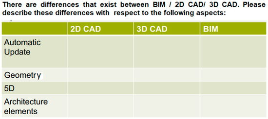 - Three theoretical questions—these short questions have the form of a brief question that requires a written answer no longer than a few sentences or a paragraph. The students have to describe or explain things like the basic definitions, the history of CAD/BIM, or current integration approaches. The maximum score for each question is 10 points. An example of these questions is presented in Figure 2.