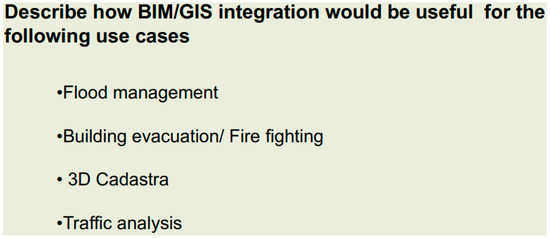 Figure 2. Example of a theoretical question. - Practical example (essay)—this part of the test has the form of a case-study/scenario question which is used to show that students can understand and integrate key concepts of the course, apply theories in a practical context, and demonstrate the ability to analyze and evaluate the obtained results. Students are asked to describe how BIM/GIS integration would be useful for the use cases, such as flood management, building evacuation, 3D cadaster, or traffic analysis (Figure 3).