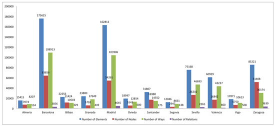 Summary of items, nodes, ways and relations in the Spanish cities under study.