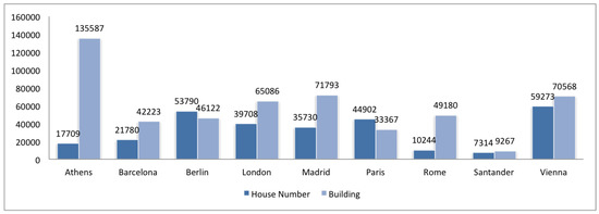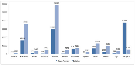 We have individually analyzed the case of Zaragoza, which highlights from the given results. We have concluded that open data of the local government has been used to enrich Zaragoza OSM dataset. There are 36,615 nodes in this city with addr:housenumber, and from them 35,432 have as data source the open data of the local government. 268 nodes have the tag building, and from them, 260 have the attribute addr:housenumber, and 245 have the open data of the local government as data source. However, ways with the tag building are 3074, and from them, 640 have the tag addr:housenumber, coming from open data of the local government a total number of 250. On the other hand, 95 ways have the tag addr:housenumber but are not labeled with the tag building. Thus, there are a high number of nodes with house number but not labeled as building, and there do not exist enough ways (labeled with building) using/overlapping such nodes.