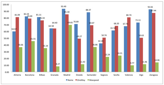 With regard to navigational queries and highway completeness, Figure 3 shows that the inclusion of the attribute name has to be improved in Almería, Granada, Oviedo, Segovia, Sevilla, Valencia and Vigo (less than 75%). The same can be said for oneway, which usually has similar rate, being better in some cases like Almería, Segovia, Sevilla and Valencia, and considerably lower in Oviedo, Santander and Vigo. The maxspeed rate is usually lower, specially in Granada, Oviedo, Valencia, Vigo and Zaragoza, with less than 15%. As was commented in the introduction, some local communities can agree to omit oneway and maxspeed, assuming “yes” and 50km/h by default. This can be the reason of low rates in some cities. However, as show in Section 3, this agreement is not always taken in other European communities.