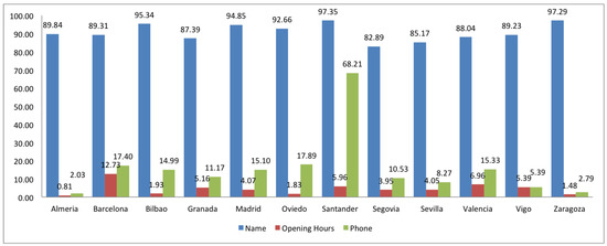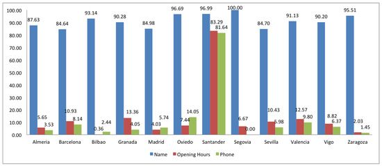 Completeness study in Spain. Percentage of name, opening hours and phone in shops.