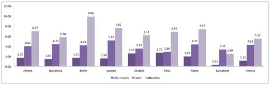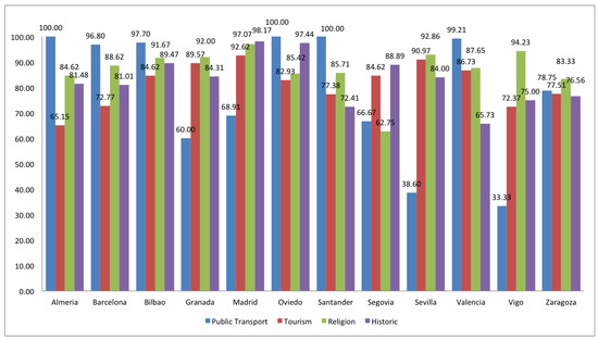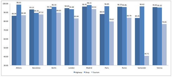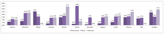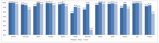 In general terms, highway information is less homogeneous than shop and tourism ones. Almería, Madrid, Segovia, Sevilla, Valencia and Vigo have more homogeneous information about highways, whereas Barcelona, Oviedo and Santander have more heterogeneous information. Bilbao, Segovia and Zaragoza have more homogeneous information about shops, while Oviedo and Santander have more heterogeneous information. Finally, Almería, Granada, Santander and Vigo have more homogeneous information about tourism, while Barcelona, Bilbao, Madrid, Oviedo, Valencia and Zaragoza more heterogeneous information.