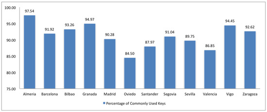 Compliance is crucial for two reasons. Firstly, OSM partners should agree in how OSM items are tagged. Secondly, OSM tools (mainly those for visualization of maps), require a common language to be able to properly draw maps. The quality of an OSM dataset is now measured in terms of percentage of OSM items with commonly used keys according to Taginfo. Basically, we use the ranking of Taginfo of most used tags for checking the conformance of OSM datasets. The use of less commonly used keys is a symptom of heterogeneous or faulty tagging. It is also a symptom of individual interpretation of the submitted data or misunderstanding about commonly used classes. Figure 7 shows the results of the compliance analysis. The 300 most used keys of Taginfo have been selected for the analysis. The most compliant cities are Almería, Granada and Vigo, while the less ones are Oviedo, Santander, Sevilla and Valencia.