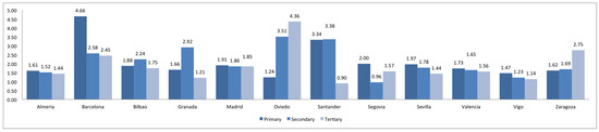 Figure 1 summarizes the main features of the analyzed cities: number of OSM elements, nodes, ways and relations. Cities have been selected according to their size (the size is measured in terms of number of OSM elements) ranging from small cities such as Almería, Bilbao, Granada, Oviedo, Santander, Segovia and Vigo to big cities like Madrid and Barcelona, including medium-size cities such as Sevilla, Valencia and Zaragoza. We only measure the number of tagged elements/nodes/ways/relations (i.e., with at least one tag). Some cities have been selected due to their touristic nature. This is mainly the case of Segovia and Granada, but it also happens in big cities, specially Madrid and Barcelona. As Figure 1 shows, usually the number of ways is greater than the number of nodes. However, Bilbao, Santander, and specially Zaragoza have a greater number of nodes. We have analyzed these three cases. In the case of Bilbao, from 11,424 tagged nodes, 6166 nodes have only one tag, and from them 2486 have only house number as tag. 3350 from the 6166 nodes are added by three users. In the case of Santander, 14,928 from 16,980 tagged nodes are added by two users, sourced from open data of the local government. In the case of Zaragoza, the number of nodes is similar to big cities, and the number of tags of them is usually (38,384 from 51,408) greater than three, sourced from open data of Spanish government (38,055 from 38,384). As conclusion, the use of certain practices by OSM contributors can increase the number of nodes with regard to ways; for instance, the use of nodes to annotate house numbers (as in the case of Bilbao) as well as the use of sourced data from Spanish government (as in the case of Zaragoza).