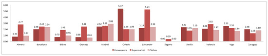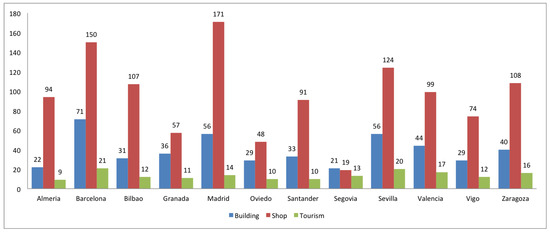 Richness analysis has as goal to assess the quality of the entity classification in categories. We have analyzed three cases of entities: building, shop and tourism. Here, the number of distinct categories used for each city has been computed. The results are shown in Figure 13. We found here that Barcelona, Madrid and Sevilla have the richest classification, while Oviedo and Segovia the poorest one. Shops are the richest entities, while building and tourism entities are poorly classified. Let us remark that the total number categories in Taginfo for each one (with a percentage of use greater than 0.1) is 53, 186 and 36, respectively. Here, we believe that higher richness in big cities is expected due to a wider variety of shops and tourism places.