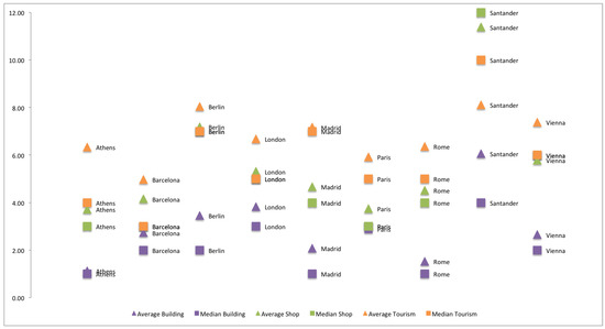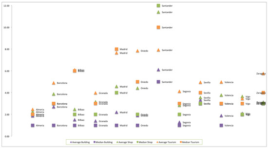 The distribution of number of keys is not normal (i.e., the average and the median value are not the same in many cases). Santander is the only city where the median number of tags is greater than the average (mainly in the case of tourism), which indicates very different tagging behavior. In general terms, buildings have lower level of granularity than shop and tourism items, which can be caused by contributors that usually focus their attention on most known places of the city. Santander provides better granularity (in all the items), while Madrid and Oviedo highlight in tourism items (an average of 6 tags or higher). In the rest of cases, tourism items have from 3 to 6 tags. Shop items have a greater granularity in Madrid and Oviedo (an average of 4 tags or higher). In the rest of cases, shop items have from 2 to 4 tags. We suspect that the main reason is the import of open data from local and regional government sources.