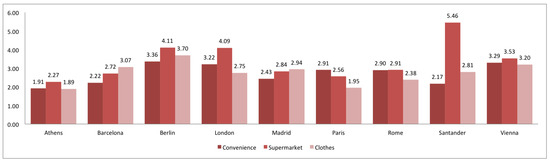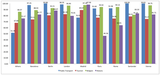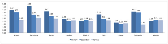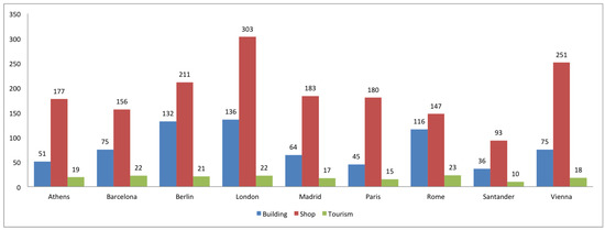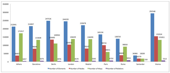 Now we show the same kind of analysis for a group of European cities: Athens, Berlin, London, Paris, Rome and Vienna, and they are compared with Spanish Madrid, Barcelona, and Santander (the most representative in terms of OSM data in Spain). Data for all the cities are taken in April 2018 (see Figure 16).