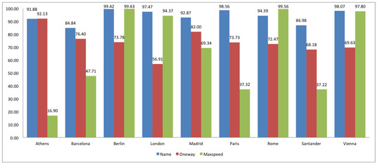 As we can see in Figure 17, the proportion house numbers/buildings is lower in Spain (Madrid and Barcelona) than in Berlin, Paris and Vienna, being similar to London, but higher than in Athens and Rome. As Figure 18 shows, the rate of occurrence of highway names in Spain is similar to other European cities. The tag oneway is used in Spain at the same rate as most of cities (with the exception of Athens and London). In the case of the tag maxspeed, the cities Berlin, London, Rome and Vienna are better labeled, while Athens and Paris are considerably worst labeled, much closer to Santander.