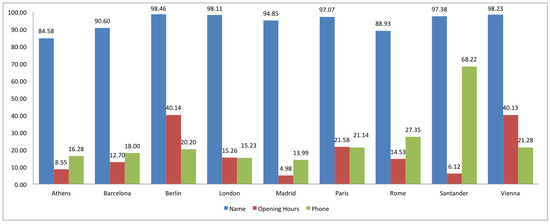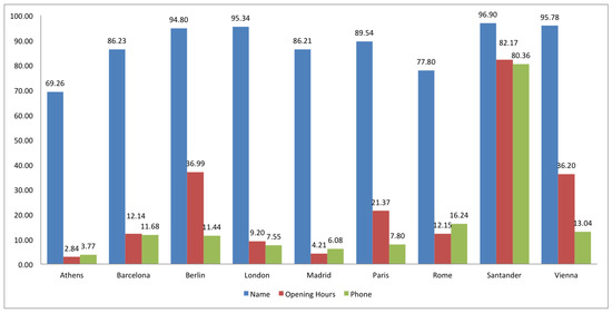 With regard to POI search purposes and amenity completeness, the results are shown in Figure 4. Here we can see that even though the name has been usually added to amenities, opening hours and phone (with the exception of phone in Santander) are usually missing. The shop completeness results are shown in Figure 5. Here, Santander is very well tagged. Opening hours and phone have a low rate in all the cities, while name is present in a high percentage. There is no compelling reason why the rate of name tagging for amenities and shops is lower in some cities. One would expect that touristic cities are better labeled in these elements, but we generally suspect that the main reason for a complete labeling is the presence of a high number of active contributors or few but highly active contributors in a certain area.