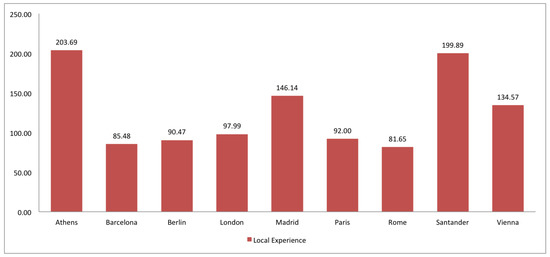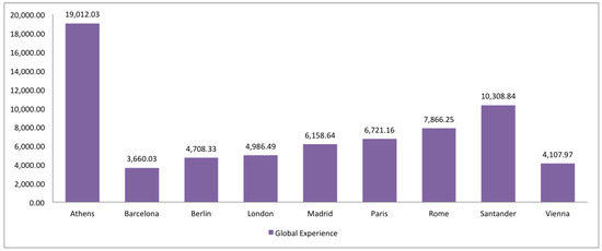 With regard to version average, most of the European cities have a higher version average (Barcelona-2.12, Madrid-2.15, Santander-2.06, London-2.47, Paris-2.53, Rome-2.49 and Vienna-2.52, and specially Berlin-3.46), while local experience of contributors (see Figure 29) is higher in Madrid and Santander (with the exception of Athens). With respect to global experience (see Figure 30) Madrid, Barcelona and Santander contributors have a medium, low and high level of experience, respectively.