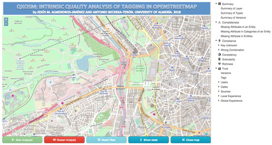 In order to facilitate the analysis of any area of the world with the same quality indicators proposed in our framework, we have developed a Web tool available at http://xosm.ual.es:8080/qxosm. This Web tool enables the selection of a certain area of the OSM planet and from the menu (see Figure 31) to run each type of analysis. The Web tool offers a summary of the layer including the number of elements (ways and nodes), number of contributions (taking into account the number of versions for each element), number of contributors and average number of versions. The Web tool enables to customize the analysis in such a way that for each type of analysis permits the selection of entities (and categories/attributes) for which the analysis is carried out. For instance, in the case of completeness (analysis of missing attributes), the tool enables the selection of the entity and the group of attributes for which the occurrence is analyzed. Moreover, the Web tool shows the results using charts reporting for each bar the percentage/number of items. The Web tool shows both aggregated and disaggregated data. For instance, the chart of granularity analysis shows the average number of keys, as well as a pie chart in which groups of keys and their percentage of use, is shown. The same can be said for richness analysis, in which the percentage of items for each category is shown in a pie chart as well as the number of different categories. The Web tool also enables the analysis of a certain area by number of versions and date of creation/modification. Finally, the user contributions (local and global experience) can be analyzed, and charts are used to visualize number of contributions, classified by user experience.