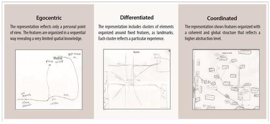 Cognitive maps vary from one person to another. However, specific features can be common to certain groups of people [25,37,38]. In a study on how people perceived, understood, and organized spatial information, Lynch [23] found there were five elements in cognitive maps: paths, landmarks, nodes (or anchor points, when geographical features are structured around them), edges (boundaries), and districts. The way in which spatial knowledge is organized in a reference system also differs in cognitive maps. Moore [39,40,41,42] proposed three types of reference systems: egocentric, differentiated, and coordinated (Figure 1). Other researchers defined only two types of reference systems: egocentric (as per Moore [39]), and another one called environmental, geocentric, or allocentric, depending on the author [43,44,45]. Moore’s differentiated reference system considers the presence of anchor points, which are ignored in the other proposals.