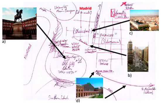 Most participants of the survey were approached within the airport’s departure area and in the train between the city center and the airport. Tourists answered the questionnaire for around 15 min, which included to make a hand-drawn sketch of Madrid, showing tourist attractions, main streets, zones of interest, the indication of the north, the location of the airport and their accommodation, and the transportation routes or stops they knew. Figure 3 shows an example of such a sketch.
