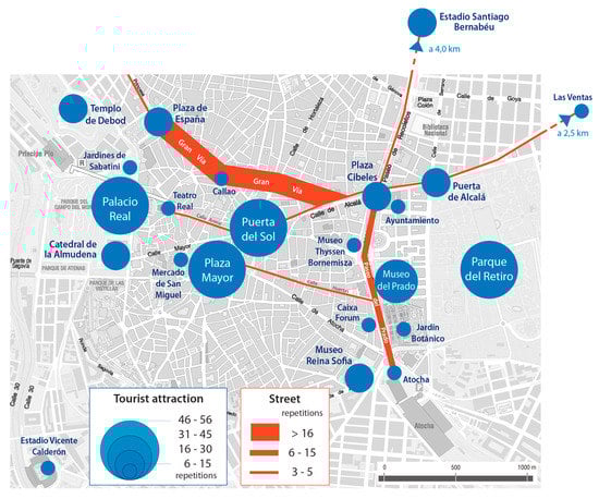 The spatial knowledge of tourists was reflected in their written answers and hand-drawn sketches. We analyzed the sketches using three categories, based on Lynch’s elements [23]: points (e.g., touristic points, transportation stops); hubs (e.g., streets, transport lines); and zones (e.g., city areas). The map in Figure 4 presents the most frequent features identified by tourists, showing the collective conception of Madrid. The size of the circles and lines reflects the number of times the feature appeared in their answers or sketches. Except for Gran Vía hub, the most frequently-mentioned features were POIs: Puerta del Sol, Plaza Mayor, Palacio Real, and Parque del Retiro. The number of zones written or drawn were minimal.
