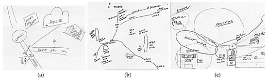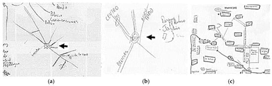 Among the particularities observed in the sketches of all participants, there were POIs with distinctive architecture represented in 2D and 2.5D (Figure 5a), and POIs structured around metro lines (Figure 5b) and zones associated with shops, museums, and bars/restaurants (Figure 5c). For anchor points, some sketches were structured around a POI close to the tourist’s accommodation (Figure 6a) or around the most frequently used transport stops (Figure 6b). However, some sketches did not feature any anchor points at all (Figure 6c).