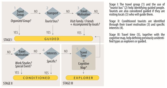 Decision diagram for determining the type of a tourist, according to the five main factors impacting the travel experience.