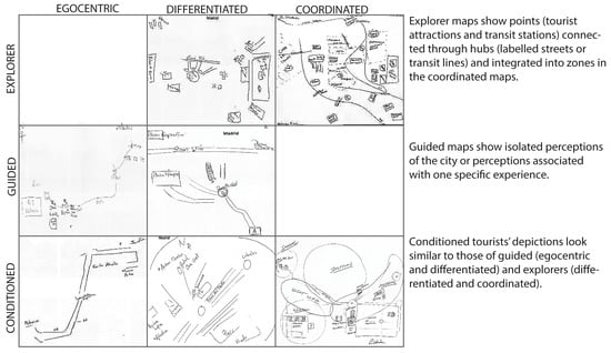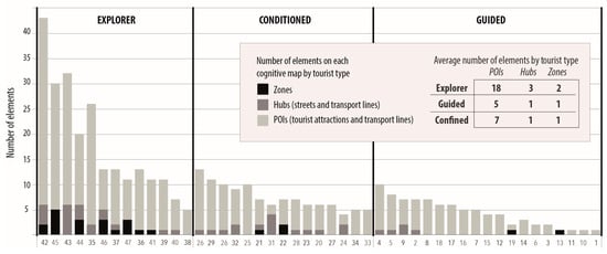 Using the decision diagram in Figure 7, we identified the types of the 47 participants. We found 13 Explorers (including T2, T3, and T5 of Figure 1), 19 Guided (including T6), and 15 Conditioned participants (including T1 and T4). We next looked for patterns in their sketches, looking for the number of elements in each category (POIs, hubs, zones—Figure 8) and reference system used (egocentric, differentiated, and coordinated, as in Figure 1). The characteristics of tourist types and their sketches can be described as follows: